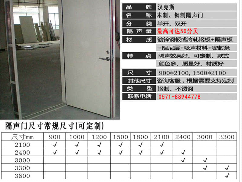 杭州漢克斯是專業(yè)的噪聲治理公司和隔音門生產(chǎn)廠家,可以生產(chǎn)多種類型的防火隔音門。從推拉方式來看有單開隔音門、雙開隔音門,推拉隔音門、滑動隔音門等。在隔音效果上來說有30分貝、35分貝、40分貝、45分貝、49分貝五種隔音效果可選。
