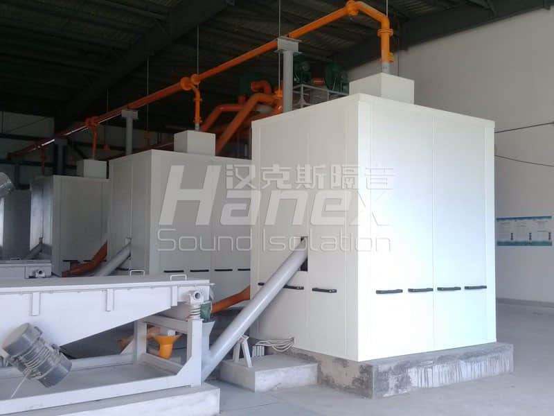 案例簡介:廠區車間內4臺破碎機運行時噪聲量達到120分貝,影響廠區環境和工人工作。漢克斯對每臺破碎機單獨設置隔聲罩后,距離設備一米處測得噪聲值為80分貝,低于國家衛生標準,符合降噪要求。隔聲罩內具有通風散熱照明功能,能夠保證內部設備的正常運行。