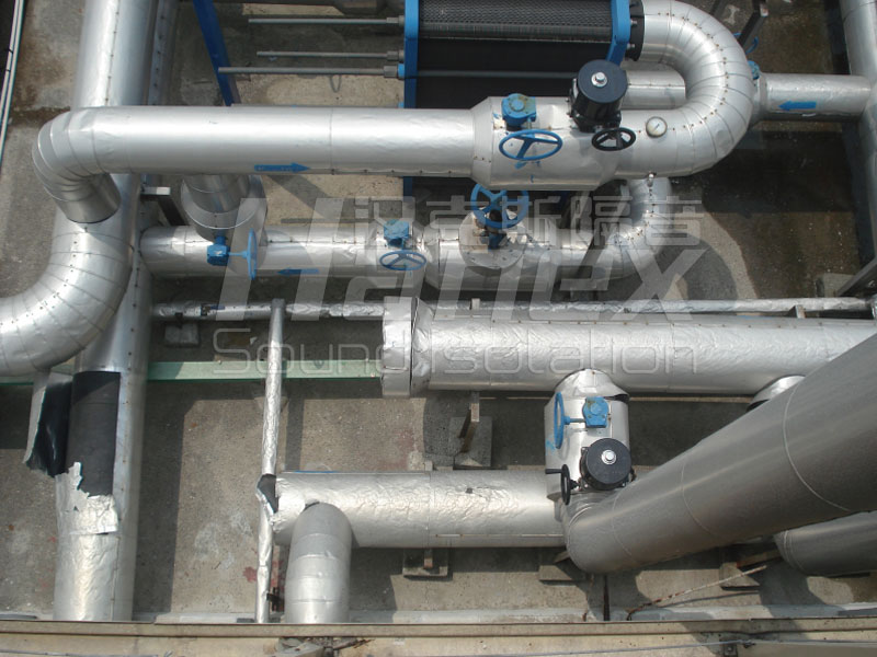 各機組水泵的水管穿過墻體時,使得管路直接向墻體傳遞振動噪聲。本方案將在這些穿墻管路上加裝隔振,套管與穿墻管之間的間隙里填滿減震隔音材料(帶一定阻尼),在隔振的同時確保密封,避免因泄露導(dǎo)致水泵房中的噪聲傳播到隔壁房間里。