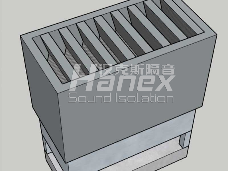 (2)消聲器總高度1500mm,分2段消聲,風口上方留有600mm空腔。根據現場勘測所得噪聲頻譜分析,空調外機排風口噪聲與五樓精密空調類似,低頻噪聲較高,因此選用100mm-150mm厚消聲插片,間距控制在100mm-150mm,保證消聲器對低頻噪聲的消聲量。