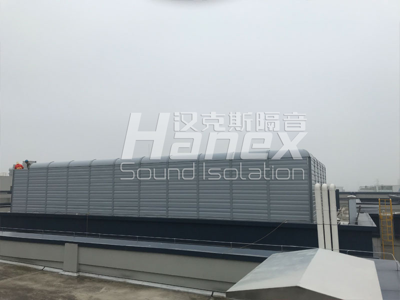 4臺風冷熱泵機組壓縮機噪聲為本項目重點噪聲源,線針對壓縮機的嗡嗡低頻聲,光外圍一層屏障遮擋效果有限。設計對壓縮機部分進行二次處理,對壓縮機加裝一個5面包圍小型隔聲罩。隔音罩對地面一側開口,留作壓縮機通風散熱,其余5面都由復合鋼制吸隔聲板制成。