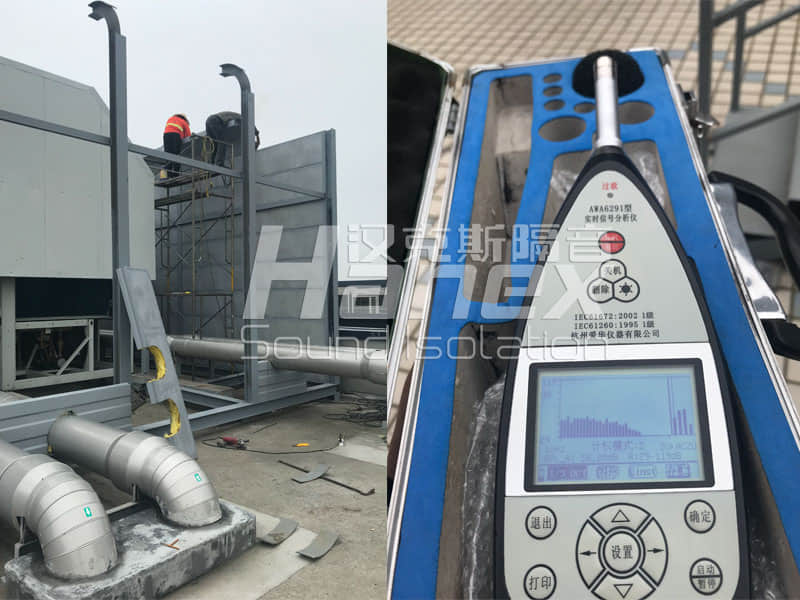 我們曾經在風冷熱泵機組噪聲處理項目中,我們設計的降噪方案使未處理的風冷熱泵機組噪聲值95dB,經過降噪處理后,同一位置監(jiān)測噪聲值<65dB,取得了降噪30分貝的滿意結果。
