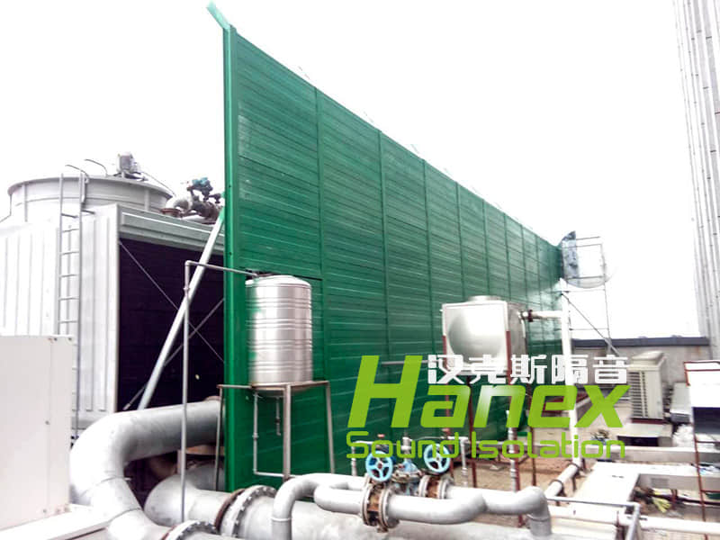 1、在冷卻塔周邊安裝吸隔聲屏障阻隔水泵和冷卻塔運行時的聲源外泄,屏障包圍熱泵空調設備四面,長度≥85 米,高度≥6 米,厚度≥100mm。